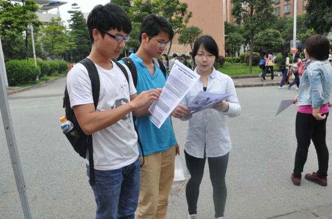 派传单的同学用心地做着宣传,耐心地和路人介绍着活动内容。