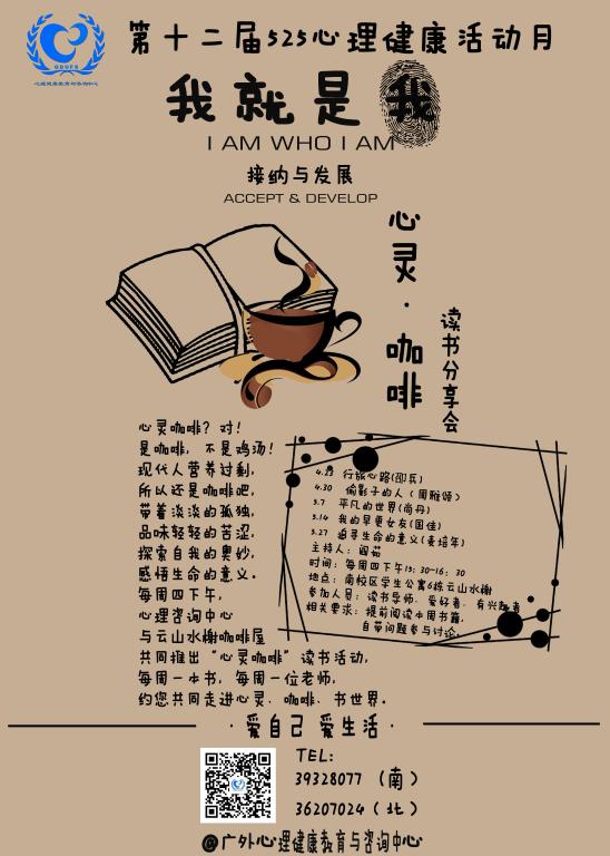 心灵咖啡?对!是咖啡,不是鸡汤!当今的人们多少都有点营养过剩,所以还是咖啡吧,带着淡淡的孤独,品味轻轻的苦涩,探索自我的奥妙,感悟生命的意义。每周四下午,心理中心与云山水榭咖啡屋共同推出“心灵咖啡”读书活动,每周一本书,每周一位老师,约您共同走进心灵、咖啡、书世界。