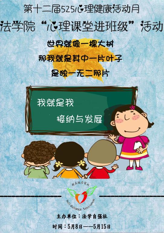 以“我就是我•接纳与发展”为主题的第十二届“5.25心理健康活动月”来临之际,法学自强社将组织法学院各年级学生以班级为单位开展“心理课堂进班级”的活动,让各班同学在该活动中通过学习心理健康知识、参于心理小游戏等多种形式认识自己、接纳自己并使自己得到发展!