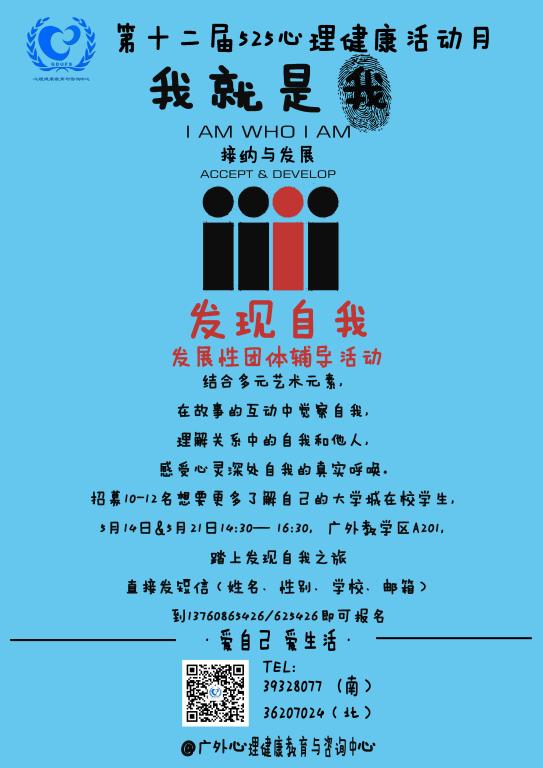 5月14日14:30—16:30 在广外的教室A201开展一次发现自己的团队培训,结合音乐、美术、戏剧、游戏等多元艺术元素,通过回忆童年、塔罗魔法心、困惑分享帮助更多的人找到回家的路。只需发短信(姓名+性别+学校+邮箱)到13760865426/625426即可参加报名。