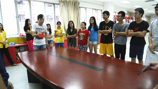 第一个游戏是接力乒乓波。参与者必须在接到球的同时回答裁判的问题。在这一项游戏中,大家可真是急中生智,展现了日常生活中不为人知的一面。