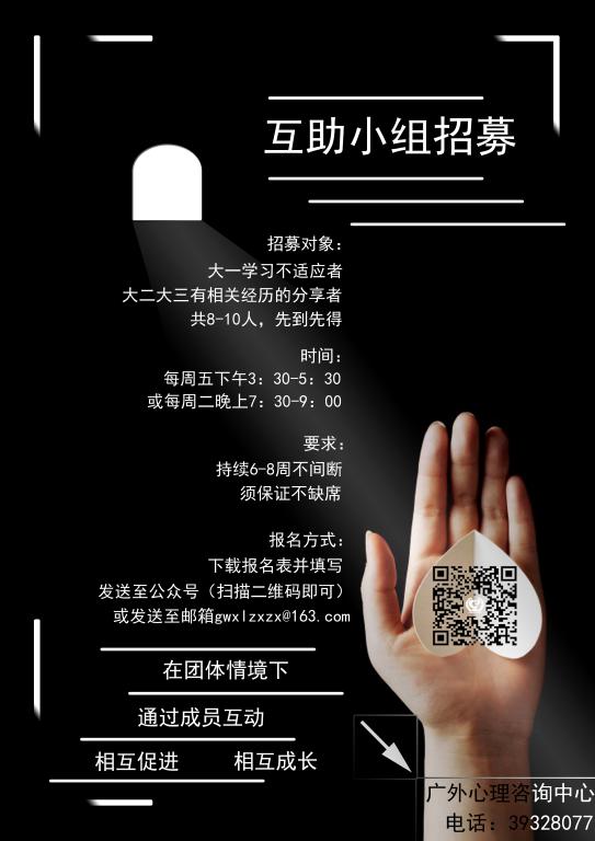 对象:面向大一大二大三招募,大一:学习不适应者,大二大三:(曾有)学习不适应或者相关经历经验分享者。