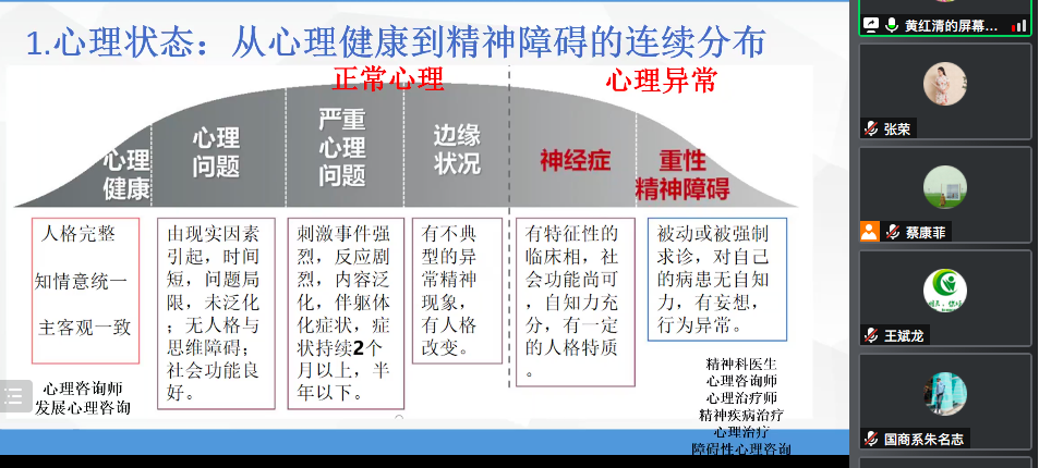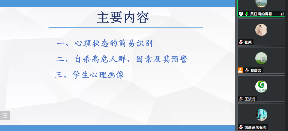 黄红清结合自身工作经验、学术研究结果和学生真实案例,从“心理状态的简易识别” “自杀高危人群、因素及其预警” “学生心理 画像”三大方面,对如何识别和干预大学生高危人群的心理危机进行了详尽讲解。