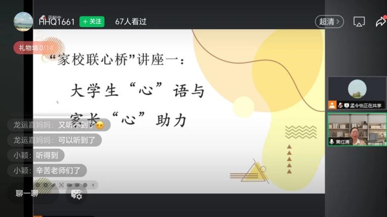 为进一步加强家校沟通,发挥家校教育合力,促进大学生的成长,9月17日晚,学生工作部心理健康教育与咨询中心开展了“家校联心桥”系列讲座之“大学生‘心’语与家长‘心’助力”新生家长心理健康教育直播讲座。本次直播由心理健康教育与咨询中心副主任黄红清主讲,孟令怡老师主持。