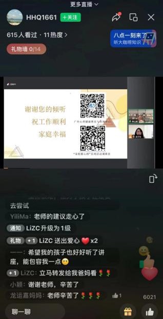 随后,黄老师从家庭治疗的角度出发,向家长们提出“给予孩子信任、从养育者和决定者转变为陪伴者和支持者”等有效建议,同时分享了很多实用的亲子相处方法,真正做到赋能家长、家校联合,共同助力学生的“心”成长。直播现场进展顺利,氛围热烈,家长纷纷在评论区积极互动,反响良好。