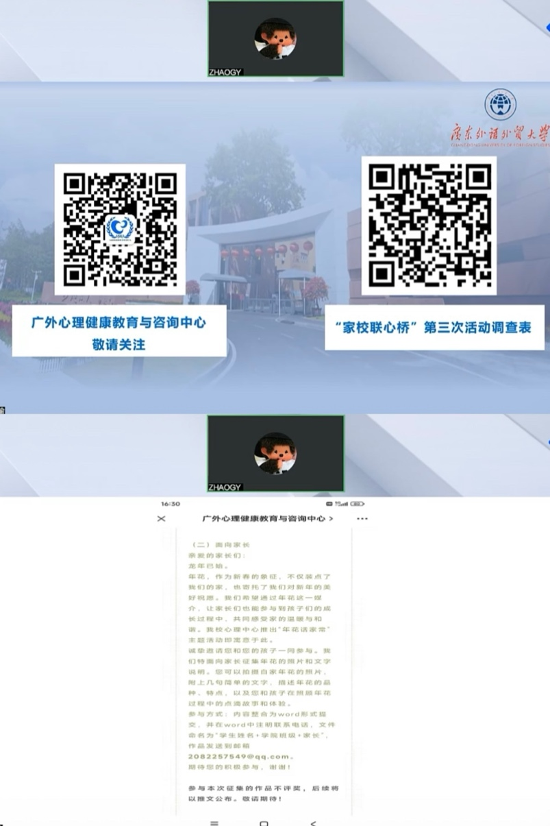 为了进一步加强家校沟通,发挥家校教育合力,共同护航大学生的健康成长之路,广东外语外贸大学心理健康教育与咨询中心于3月15日晚,推出了“家校联心桥”系列讲座的第三场直播。本次直播由学生工作部副部长、心理健康教育与咨询中心主任赵观音主持,心理健康教育与咨询中心龙贵瑜老师主讲。
