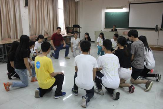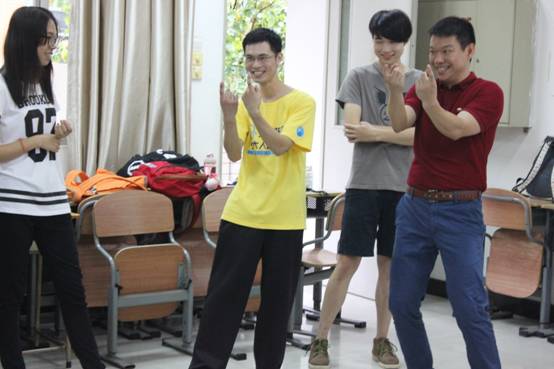在这个过程中,庄老师穿插了一个培训的反例项目。但是他并没有事先告诉素拓成员们,而是在项目结束后问他们对于这个游戏的感想。他通过让素拓成员们亲身体验的方式,告诉他们做培训要尊重别人,要顾及他人的感受。不能为了引起大家的笑而去做低俗的、不尊重人的项目培训。这引起了大家的思考,给了成员们启发。此外,在最后热身游戏中,老师说完成任务用时最长的队伍会有一个难忘的“奖励”,而不是说输的队伍会有惩罚。而在用时最长的队伍接受“奖励”——跳舞时,老师也在一旁尽力地和大家一起跳,引导大家放开来,“告诉”大家他也在和他们一起跳。以此现身说教,教导我们一些带培训的方法。