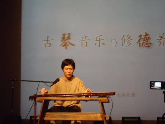 讲座围绕古琴音乐与修德养生,从古琴和音乐治疗两个方面展开。谢老师依次介绍了古琴的形制、琴音、琴谱、琴法和琴道,着重强调古琴音乐的精髓在于“随弹而然”。谢老师还演奏了多首美妙的乐曲并与同学们交流其精华所在。